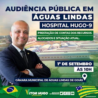 O deputado federal Vitor Hugo (PSL-GO) promoverá uma audiência pública, no dia 1º de setembro (quarta-feira), às 10h, na Câmara Municipal de Águas Lindas, para prestar contas dos recursos enviados ao Hospital Hugo 9 para a compra de equipamentos.